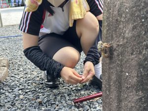慰霊碑の足元にはセミの抜け殻…と脱皮途中の成虫が…