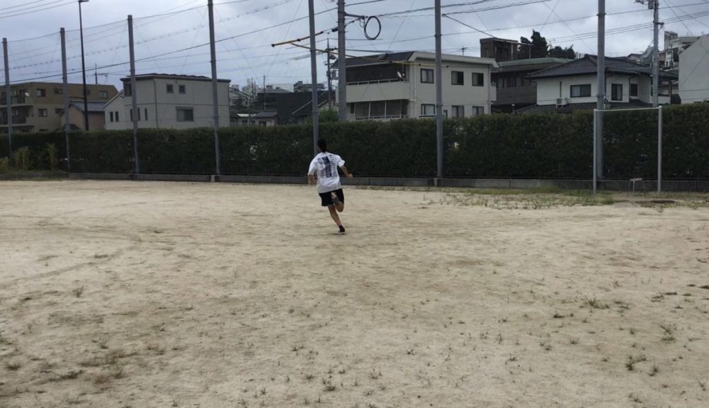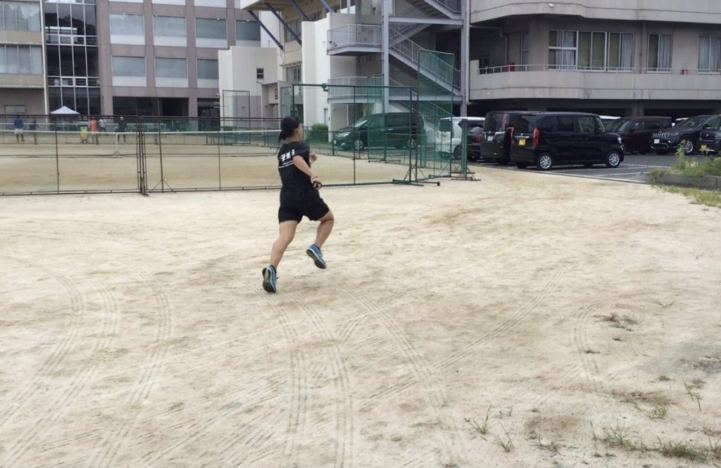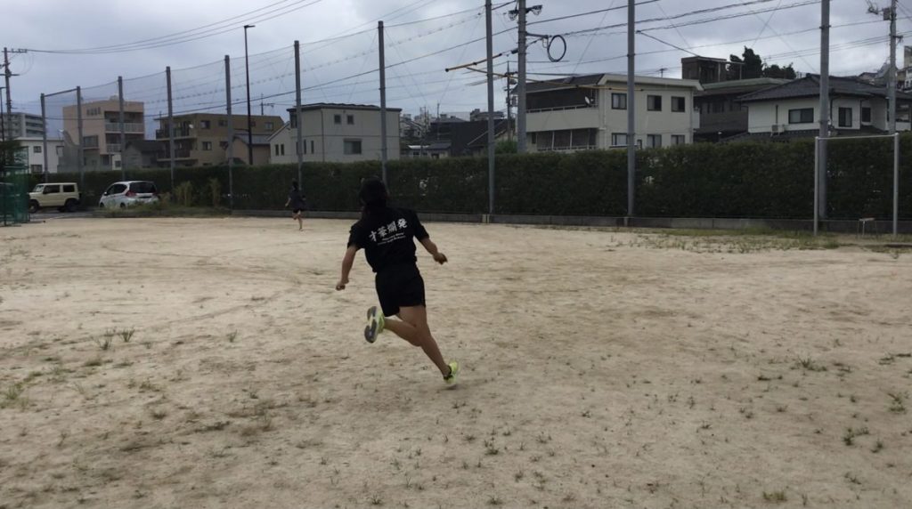 そのあとはスパイクに履き替え、70mの加速走を行っていきます。20m地点までにしっかりと加速し、そのスピードを残り50m維持しながら走り切ります。