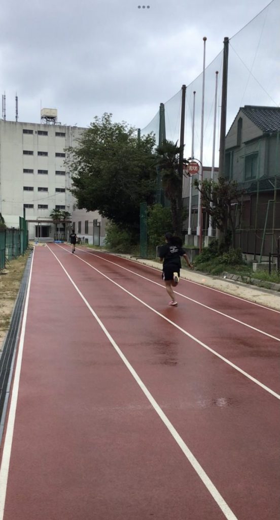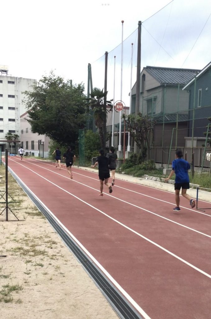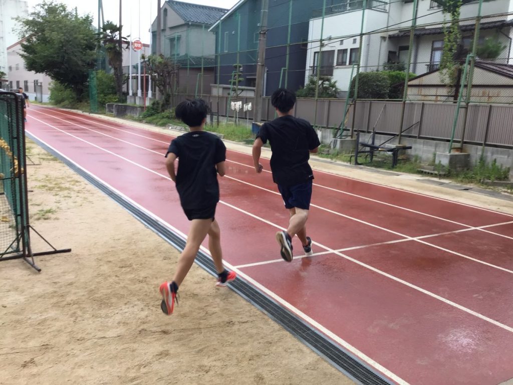 アップをしているときはまだぽつぽつと雨粒が落ちてくるくらいでしたが、本練習に入る頃には小雨程度に雨が降り始めてしまいました。しかし、雨の中でも試合は行われますし、連日の照りつく太陽のもとで走っていた長距離陣にとっては、火照った体を冷ますちょうど良い雨となったのではないでしょうか。