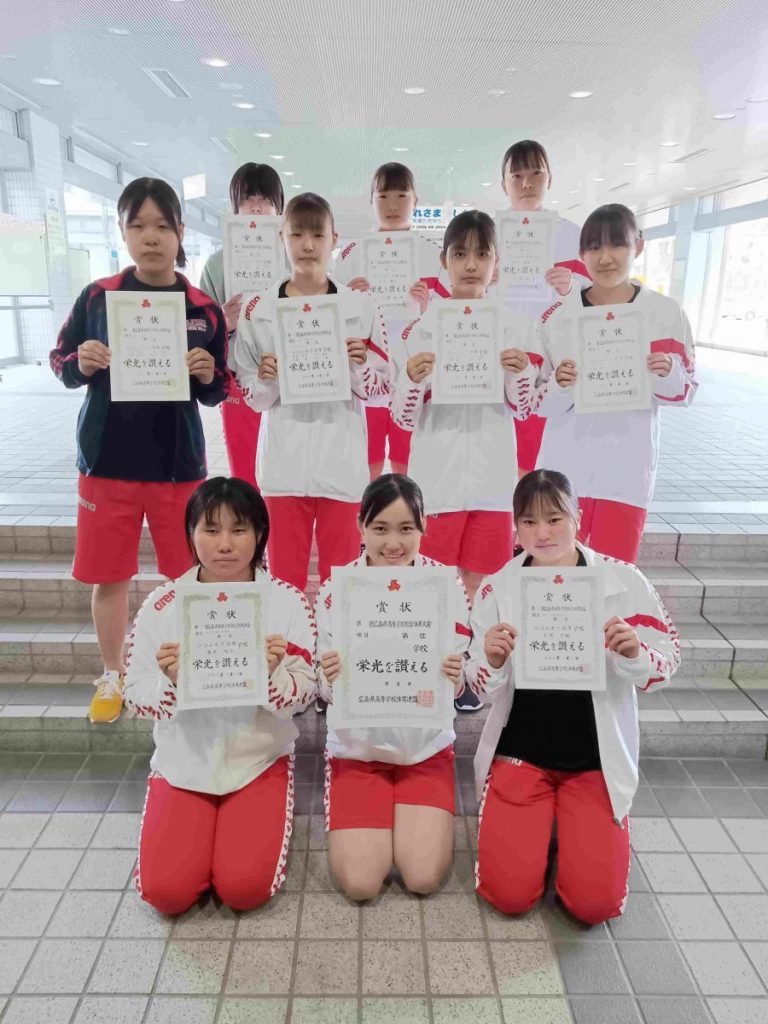 翌週に行われた広島地区高等学校選手権大会では、石原さんの100m・200m平泳ぎ2冠、桑原さんの400m・800m自由形2冠の他にも個人種目入賞多数、400mリレー2位、800mリレー2位、そして400mメドレーリレーはわが校始まって以来の悲願の優勝をすることができました。団体総合は準優勝でした。