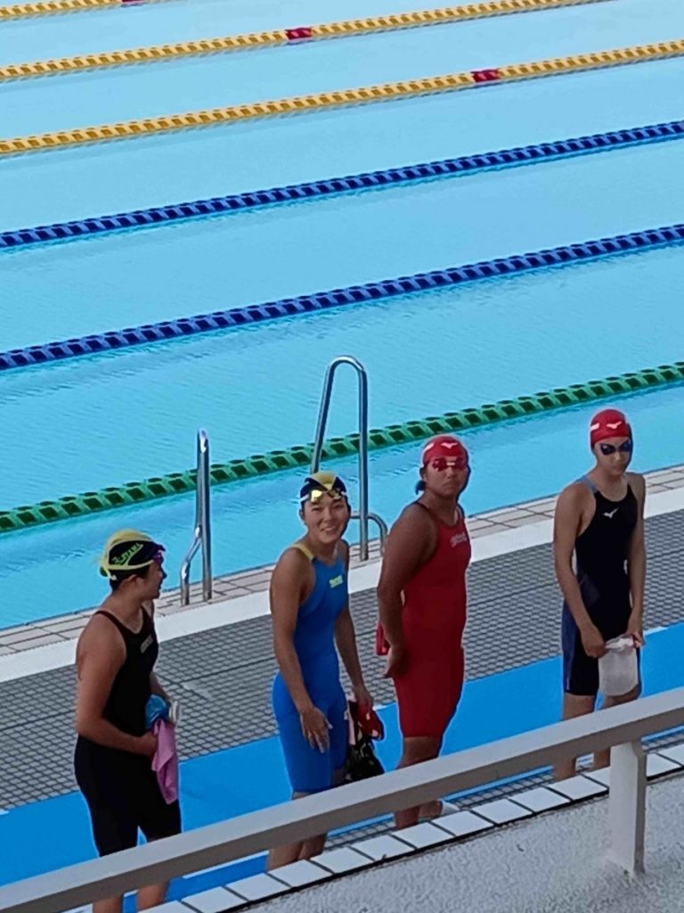 「晴れの国岡山」というイメージどおり、大会中は晴れてしかも屋外プールのために水温も高いという厳しいコンディションでしたが、それでも選手達は頑張り、本校ベストタイムを上回って泳いでくれました。昨年度出場したインターハイには手が届きませんでしたが、精一杯泳ぎ抜きました。